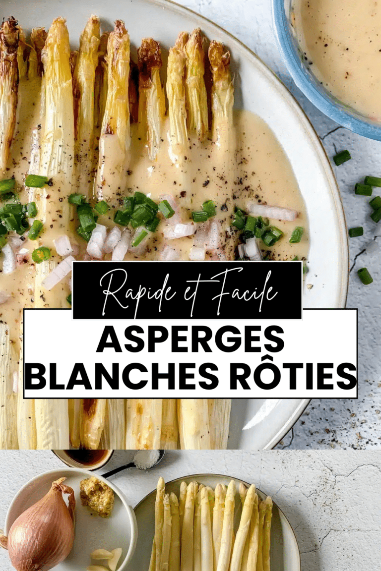Recette ultra simple et chic : asperges blanches rôties au four nappées d’une vinaigrette au vinaigre de Xérès, échalote et moutarde de Dijon 🌿 Parfait en accompagnement de printemps, menu de Pâques, brunch ou dîner léger. Sauce polyvalente à garder pour salades et légumes rôtis.