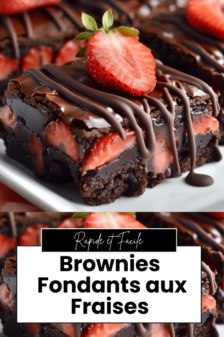 Brownies fondants au cacao, garnis de fraises fraƮches et nappƩs de ganache au chocolat. Un dessert spectaculaire et gourmand.