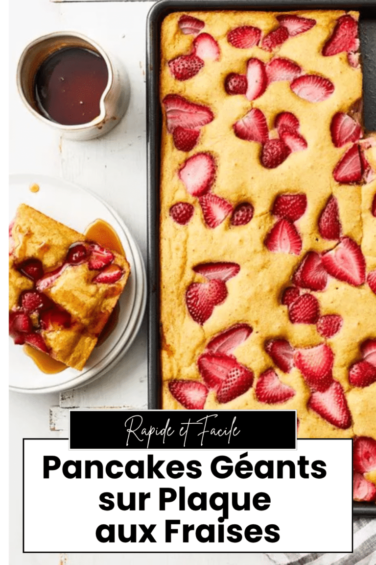 Fini les pancakes un par un Ă la poĂŞle pendant que tout le monde attend ! Ces pancakes gĂ©ants sur plaque se prĂ©parent en un seul geste : on verse la pâte sur une plaque, on dispose les fraises par-dessus et on enfourne. En 35 minutes, vous obtenez 12 parts moelleuses, lĂ©gèrement dorĂ©es, avec la douceur des fraises fraĂ®ches et un soupçon d’extrait d’amande. La farine complète apporte des fibres et des nutriments, le babeurre donne un moelleux incomparable. Servez avec un filet de sirop d’Ă©rable et c’est le brunch parfait — pour toute la famille, sans stress.