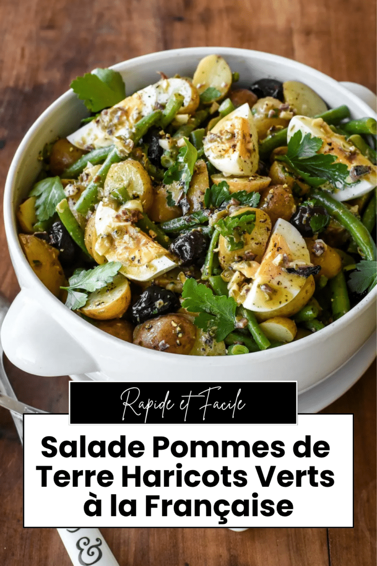 Cette salade pommes de terre et haricots verts à la française, c’est la preuve qu’une salade de pommes de terre n’a pas besoin de mayonnaise pour être irrésistible. Les pommes de terre nouvelles sont fondantes mais tiennent bien, les haricots verts gardent leur croquant et leur belle couleur vive grâce au bain glacé, et les œufs durs apportent la protéine. Le vrai secret, c’est la vinaigrette : huile d’olive, citron, vinaigre de vin blanc, moutarde de Dijon, ail, olives noires et câpres — un mélange méditerranéen relevé, acide et parfumé qui imprègne chaque morceau. Et le meilleur ? Cette salade est encore plus savoureuse le lendemain, quand elle a eu le temps de s’imprégner. Parfaite pour un buffet, un pique-nique ou un dîner d’été léger.