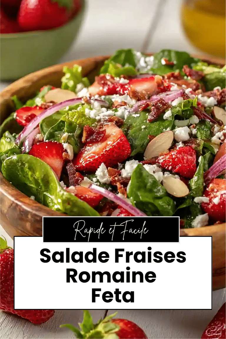 Cette salade fraises romaine feta, c’est le genre de plat qui transforme une simple salade en quelque chose qu’on a vraiment envie de manger. Les fraises bien mûres apportent une douceur juteuse, la feta relève le tout avec sa pointe de sel, et les amandes effilées grillées ajoutent ce croquant irrésistible. Le secret, c’est la vinaigrette maison : du miel, de la moutarde, du vinaigre de cidre et une fraise mixée dedans pour un goût fruité subtil. C’est frais, coloré, prêt en 20 minutes, et ça accompagne aussi bien un barbecue d’été qu’un déjeuner léger en semaine.
