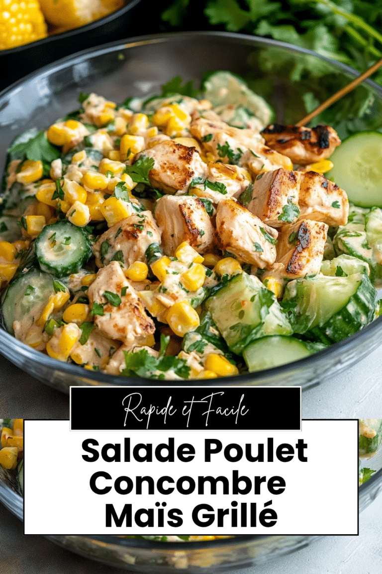 Cette salade poulet concombre maïs grillé façon street corn, c’est le genre de plat qui transforme un simple lunch en moment de bonheur. Le poulet grillé apporte la protéine et le caractère, le maïs légèrement caramélisé donne une douceur fumée irrésistible, et le concombre ajoute la fraîcheur et le croquant qui équilibrent le tout. Le secret, c’est la sauce : un mélange crémeux de mayonnaise, yaourt grec, citron vert et paprika fumé qui rappelle les saveurs du fameux elote mexicain. Un filet de coriandre fraîche et une poignée de feta émiettée par-dessus, et vous avez un plat complet, coloré et addictif. 30 minutes, zéro prise de tête, et un résultat qui impressionne à chaque fois.