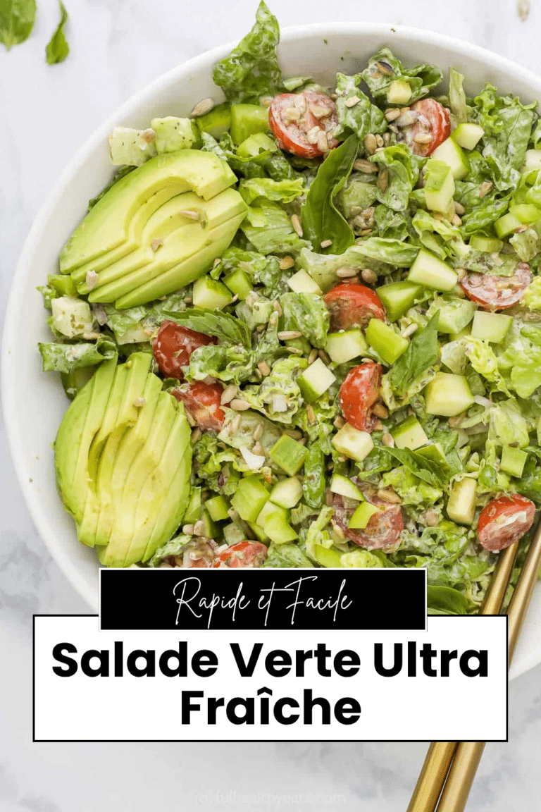 Salade croquante et crĆ©meuse aux lĆ©gumes verts, avocat et graines de tournesol, nappĆ©e d’une vinaigrette Green Goddess maison aux herbes. 15 minutes, sans cuisson.