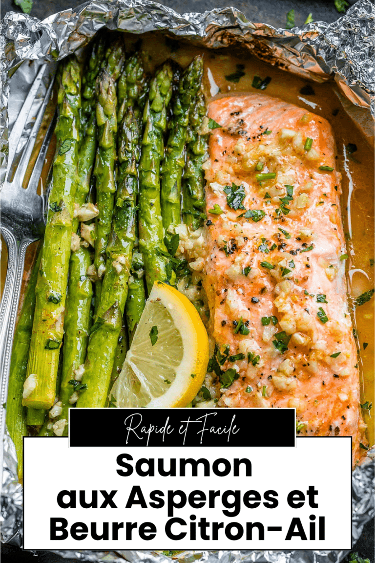 Saumon fondant et asperges croquantes cuits en papillote au four, nappés d’un beurre à l’ail et au citron. Un dîner express bluffant de simplicité.